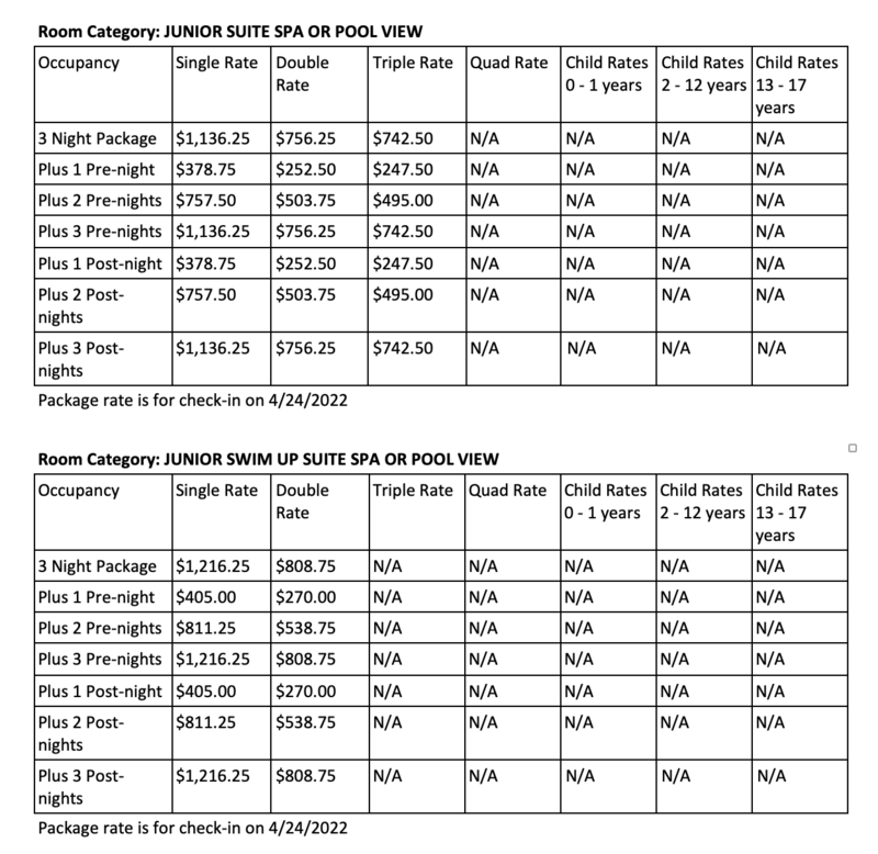 Katie & Jon's special wedding group rates have been secured and rooms have been blocked off, waiting for you to book your stay! The room categories available and their rates are listed below. All rooms are available from April 21 to 25, 2022 -- but if you would like to stay longer just let our travel agent know and she request extended dates for you.